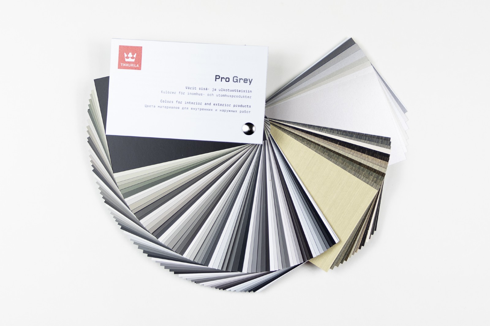 Pro Grey -väriviuhka sisältää 72 peittävää, 15 kuultavaa ja 7 Taika Paint -helmiäismaaliin sopivaa harmaata väriä. Pro Grey -värikartan värikoodit vastaavat jälleenmyyjiltä löytyvän kuluttajille suunnatun Deco Grey -värikartan värikoodeja. Neutraaleiden ja sävyllisten harmaiden avulla saat luotua entistäkin harmonisempia kokonaisuuksia.